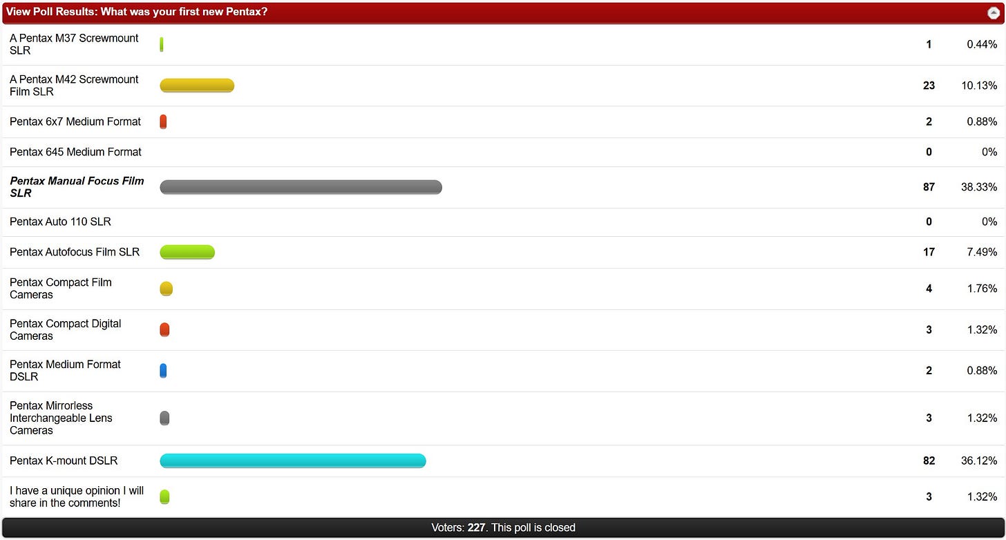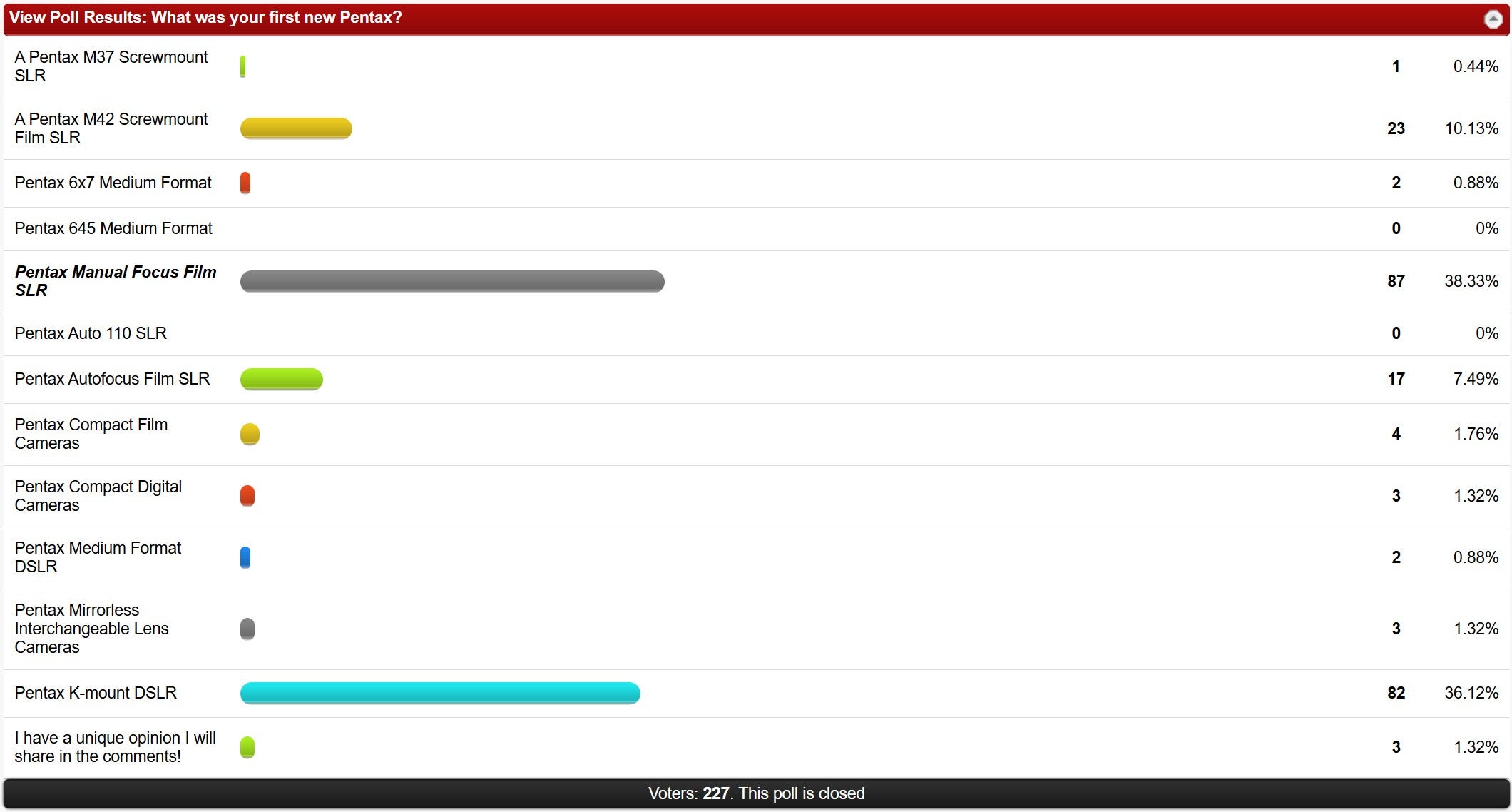 Loyal Site Supporter Sebrof made an interesting point on How many systems do you use regularly? The Best of Pentax Forums February 12 Poll: I know it's early days, with only 42 respondents at this point, but I am surprised at how few people use (or admit to using) Pentax lenses on other makes of body. I would not have been surprised if it was a third, based on forum posts. But a breakdown based on age would be interesting. I suspect that the Pentax diehards are people of a certain age, while the "other body" brigade are much younger. I bought my first Pentax, an SP!!, in 1973, and have never been tempted to switch brands. But if I had not been a Pentax owner for over 50 years I might have less brand loyalty.