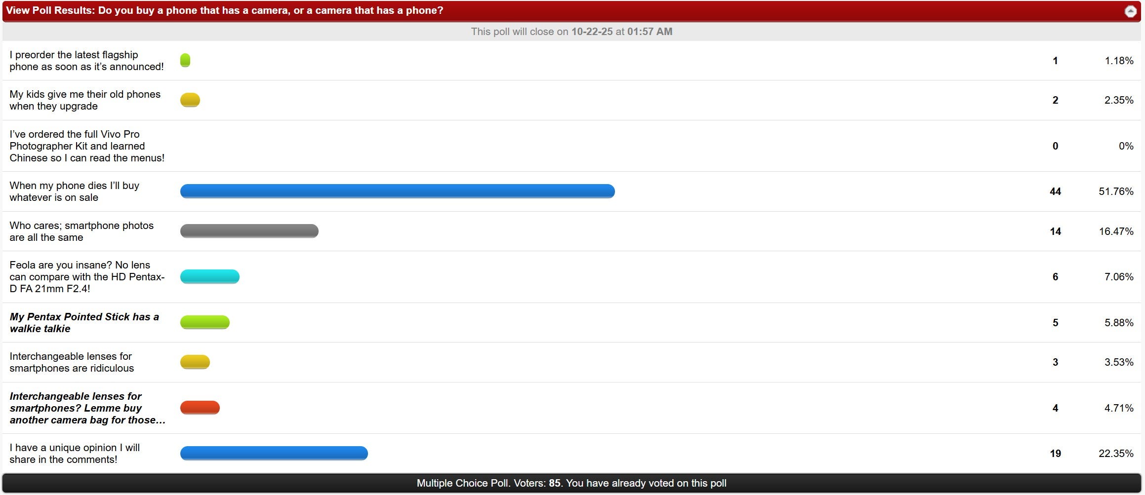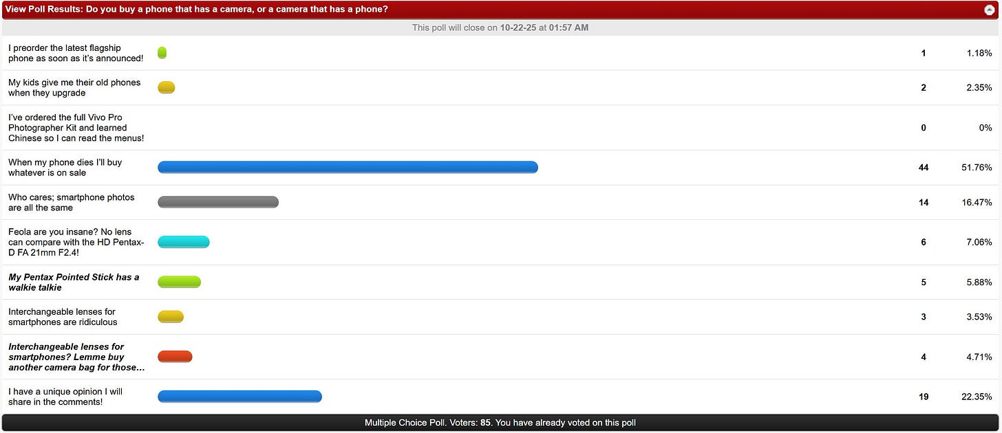 Pentaxian Dartmoor Dave on Do you choose the phone or the camera? The Best of Pentax Forums October 15 Poll: I’m using the perfect phone/camera combination: I superglued my Nokia 3510 to the back of my Kodak No.2 Autographic. So I can call and text with a phone that only needs charging once a week, and I get 6x9cm negatives from the camera.