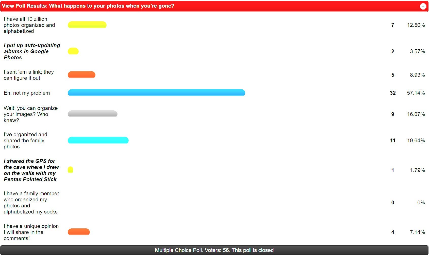 Site Supporter ramseybuckeye on What happens to your photos when you’re gone? The Best of Pentax Forums Oct 1 Poll: Is it me or are these polls getting a little morbid, I’m getting a little scared to carry my Pentax pointed stick thinking I may fall on it and be impaled.