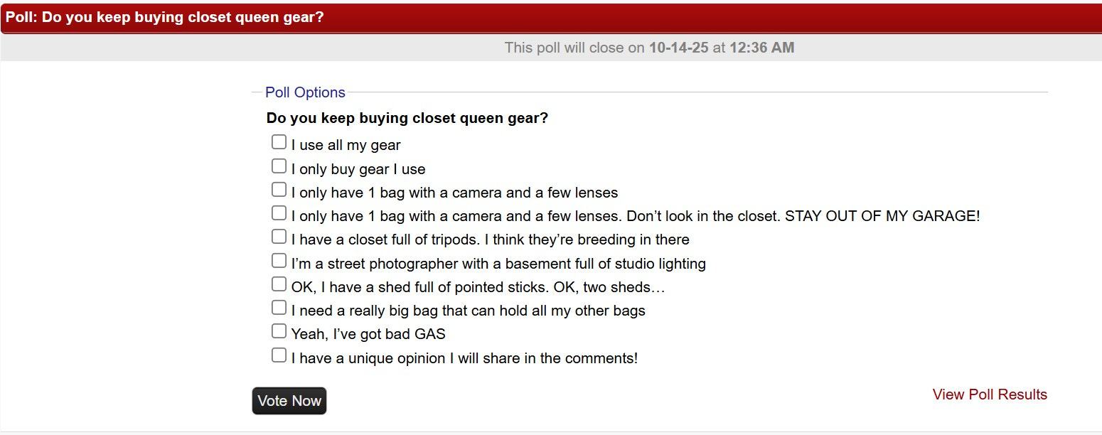 Do you have this problem too? Do you only buy gear you use? Or do you have a million monopods new in box? A phalanx of fisheyes? A belfry stuffed with bags? Vote in this week’s poll, and let us know why you do that voodoo you do so well in the comments!