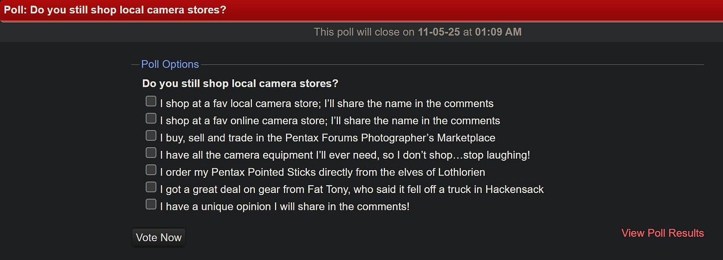 These days you can buy everything online — have you checked out the PentaxForums Photographer’s Marketplace lately? — but I’m still old school. I like to wander the aisles, checking out gear new and old. Here in Dallas/Fort Worth we have a bunch of great camera stores; way too many to list them all. I tend to hit Fort Worth Camera when I’m on the west side, and Garland Camera when I’m out east. And then there’s Don’s Photo Equipment in middle. Do you have a fav brick and mortar camera store? Do you do all your shopping online? Do you do both? Vote in this week’s poll, and let us know in the comments why you do that voodoo you do so well!