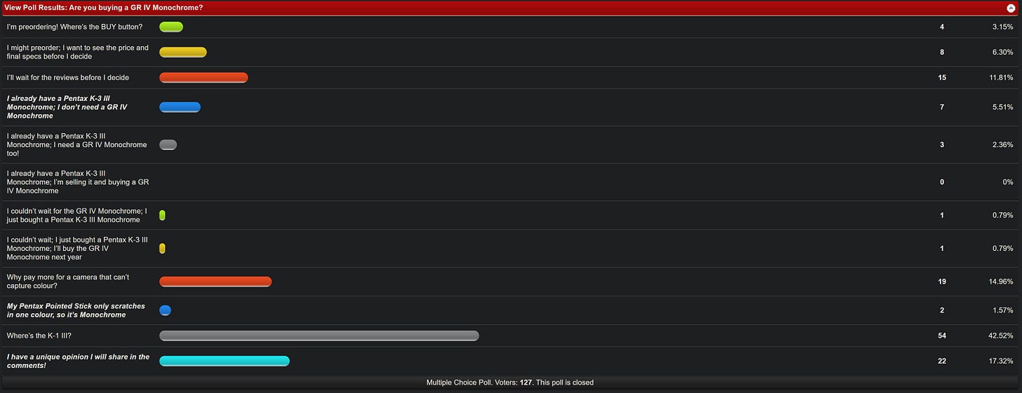 Pentaxian StiffLegged on Are you buying a GR IV Monochrome? The Best of Pentax Forums October 21 Poll: Whatcha mean it’s available in the spring, I need it NOW!! This is October and the weather has gone completely monochrome, there’s no colour for months, I need uncoloured images and gritty skies (which always struck me as odd, they spread grit on winter roads, not scatter it to the heavens - at least they do hereabouts). Ricoh, get the finger out and get it to market and hurry up, why doncha!! I don’t know, they expect us to just wait in line …