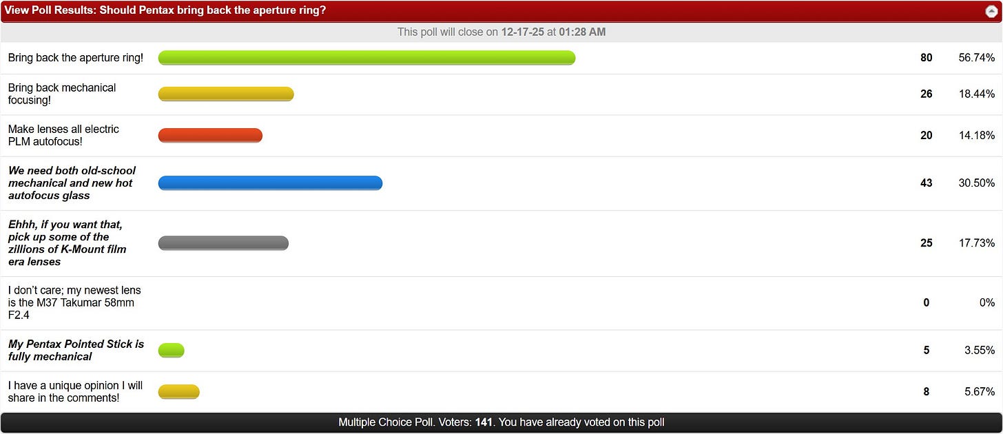 Editor’s Note: The next two Wednesdays are Christmas Eve and New Year’s Eve, so we’re going to take a break. Here’s hoping everyone has a happy and healthy holiday season. The Best of PentaxForums Newsletter will return January 8, 2026.