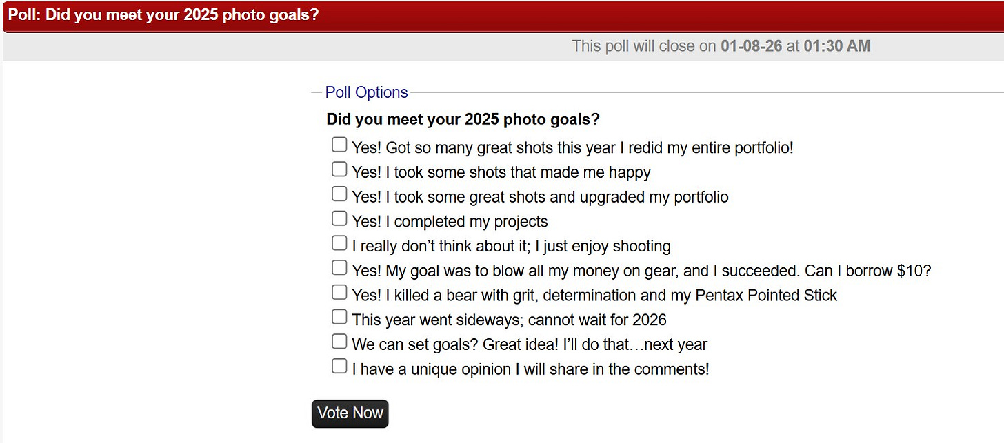 The end of the year is naturally a time for retrospection. So! Did you meet your photographic goals in 2025? Add keepers to your portfolio? Was this year a bust? Or was it Just Another Year? Vote in this week’s poll, and tell you how you did that voodoo you do so well in the comments!