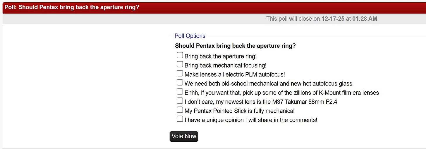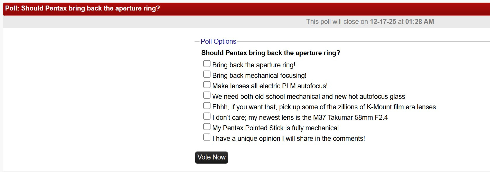 So what say you? Should Pentax bring back the aperture ring? Mechanical manual focusing? Or should all that be dropped by the wayside in favor of PLM lenses? Vote in this week’s poll, and let us know why you do what you do in the comments!