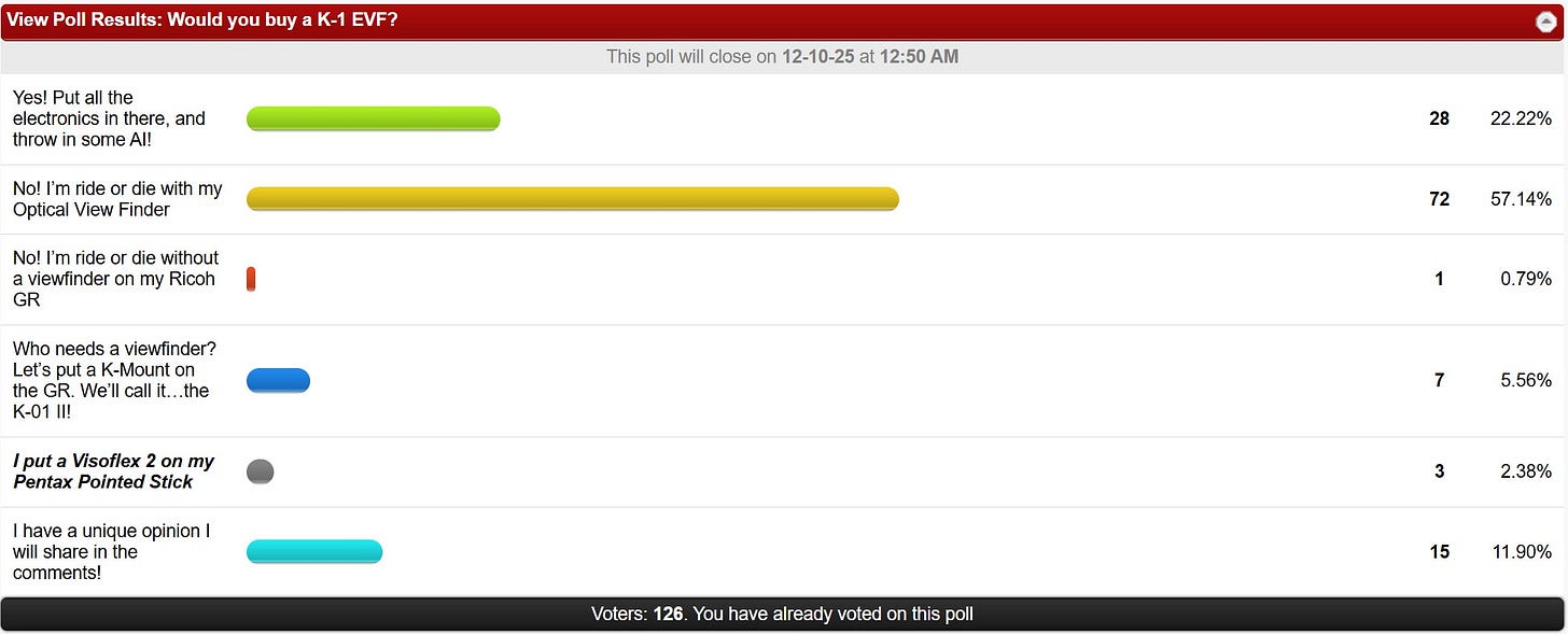 Pentaxian Dartmoor Dave on Would you buy a K-1 EVF? The Best of Pentax Forums Dec 3 Poll: Bring back the aperture ring-Heck, yes! I’d say “Hell, yes!” but that would probably be breaking a rule. Even though what I actually want to say is “F. . .I hope next week’s poll is: “Should Pentax bring back the aperture ring?” Yes, they should.