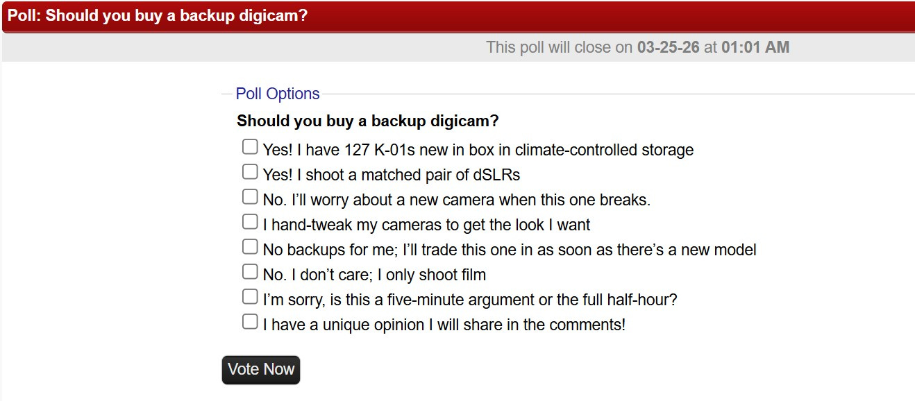 If your camera really fits your eye, should you buy a backup, just in case? Or should you trust some future camera will fit you better? Vote in this week’s poll, and let us know why you do what you do in the comments!