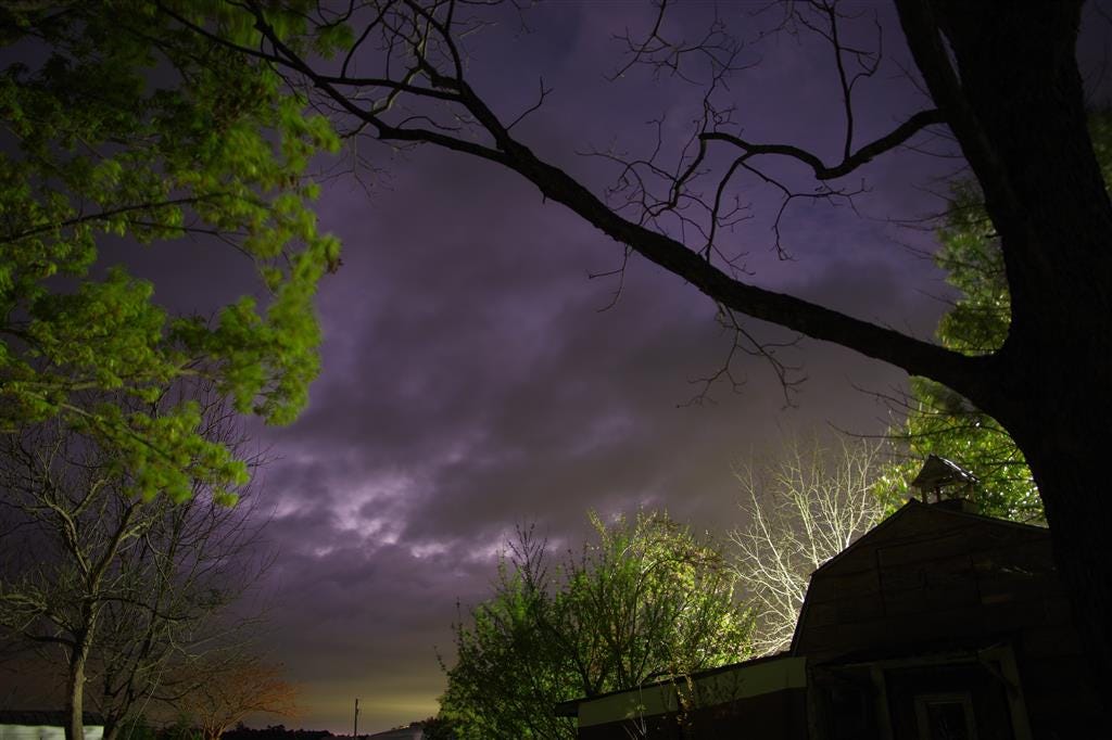And here is the entry from Loyal Site Supporter PurpleMyth: Flash of purple-Cold front with wicked weather arrived Monday at 5:30a.m. I can't resist trying to catch a bolt or two. Settings are nothing unusual, but lighting almost always shows up as purple. Bulb mode, remote control, tripod, hiding in the shadow of a tree to avoid glare from the neighbor's yard light. And I was 3 steps from the back door. I love lightning, but I watch it safely.