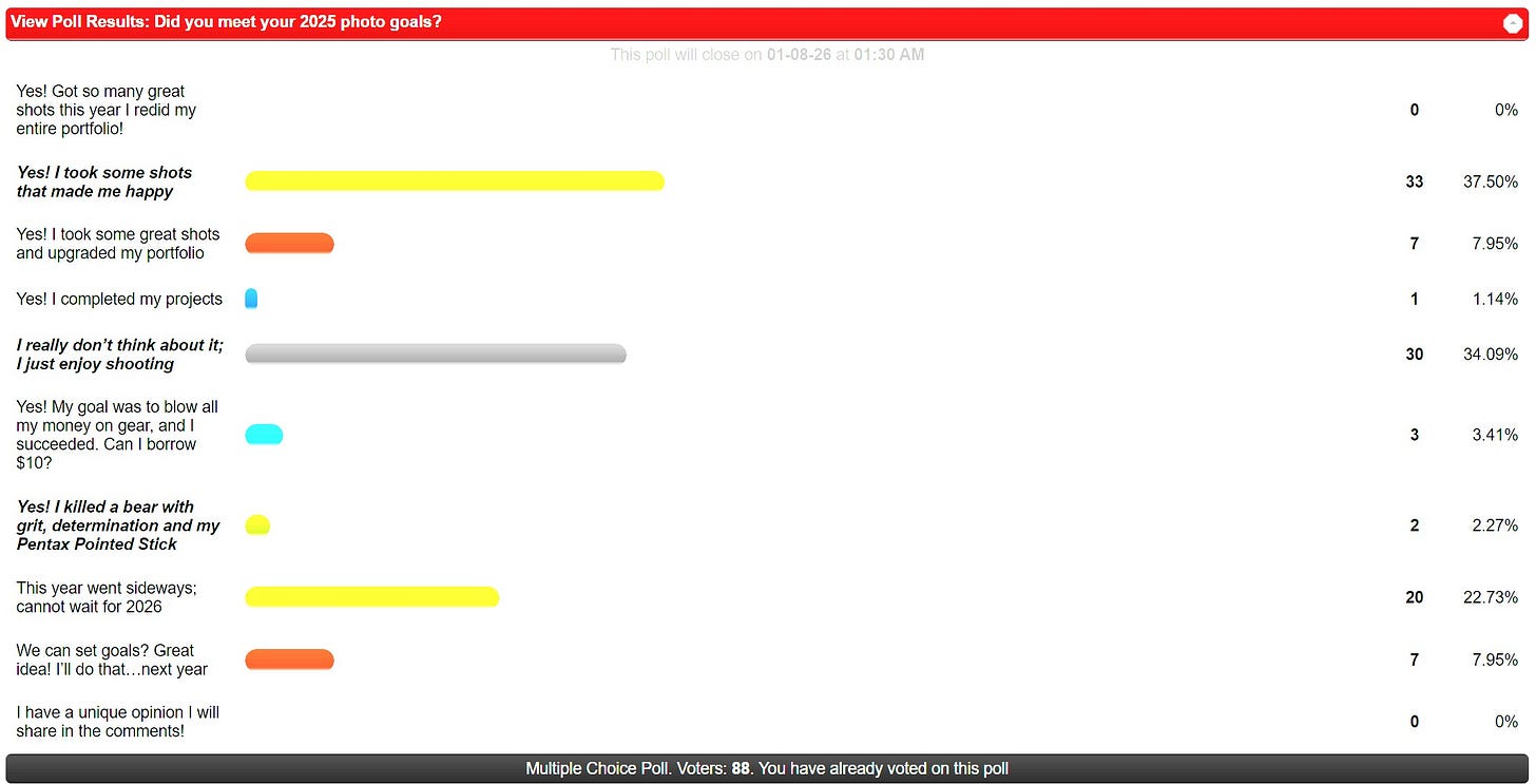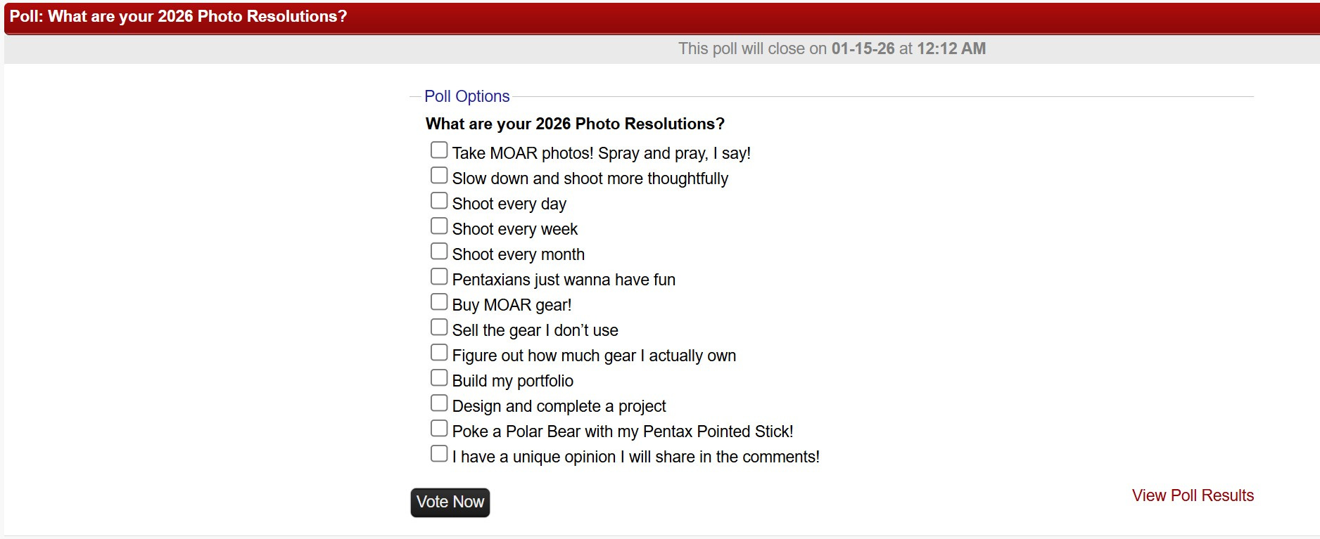 It’s 2026, and time for those New Year’s Photography Resolutions! What are your Pentaxian resolutions? Shoot more? Shoot slower and more thoughtfully? Buy more gear? Sell the gear you don’t use?